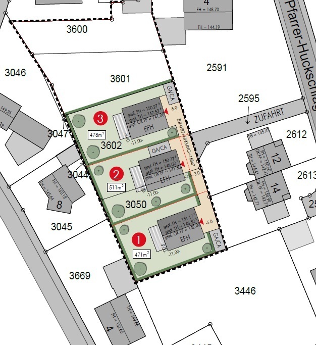 Das Grundstück ist bebaubar mit 2 Vollgeschossen und einem Satteldach mit einer Dachneigung von 35°. Die maximale Firsthöhe beträgt 10,5 m.